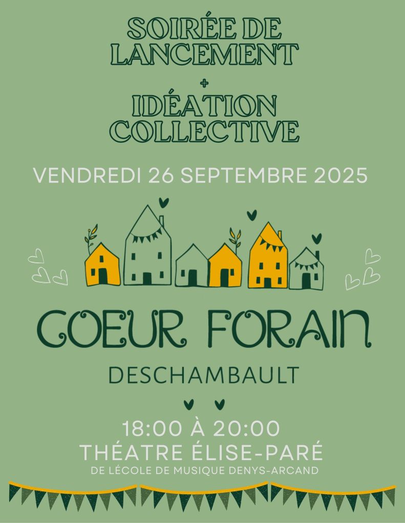 Cette année, Coeur Forain animera le coeur villageois de Deschambault. Venez partager vos idées, votre vision et vos désirs pour cette édition. On vous attend en grand nombre pour créer une année à l’image de notre magnifique village!